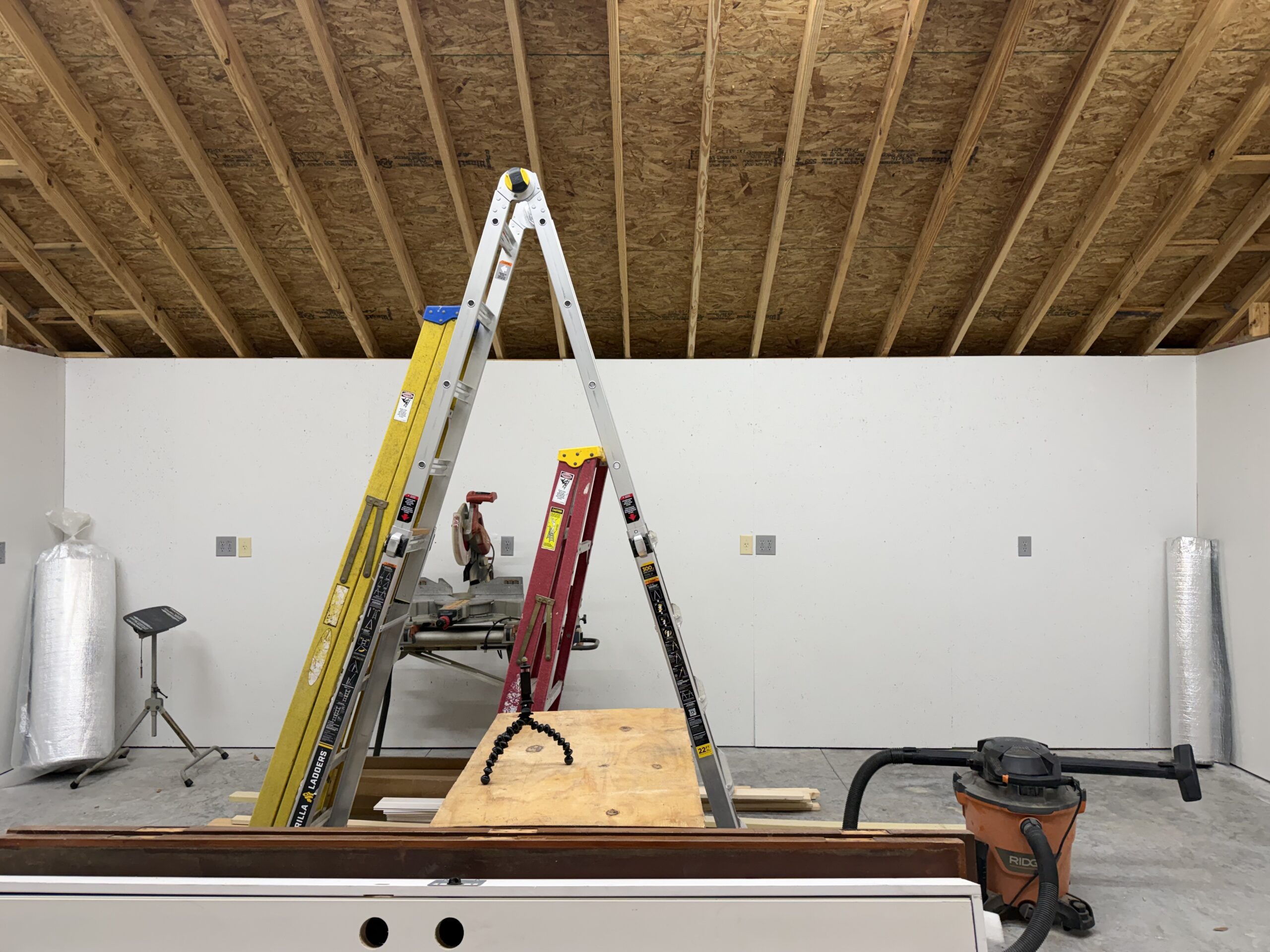 I also will be adding a reflective insulation to the to underneath sides of the roof rafters and then permanently mounting the lights on that insulation, moving them from their temporary position just sitting on top of the collar ties which tie the rafters together.